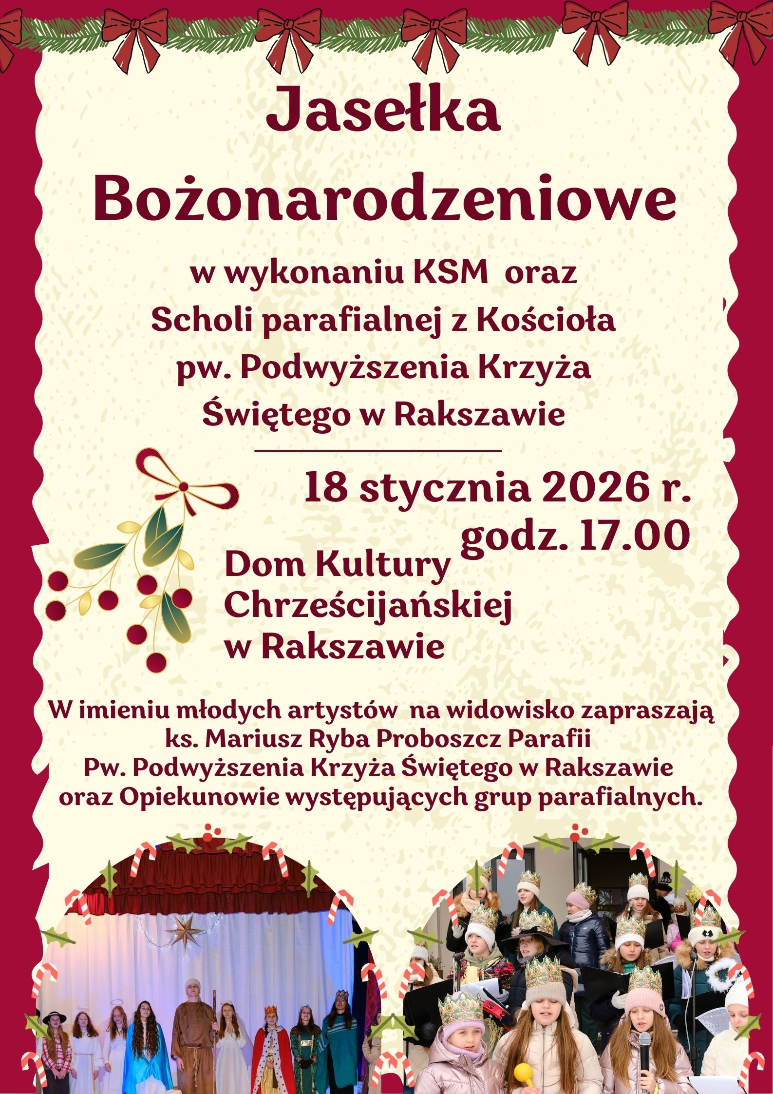 18 stycznia 2026r. w Domu Kultury Chrześcijańskiej o godzinie 17:00 odbędzie się premiera Jasełek Bożonarodzeniowych w wykonaniu KSM oraz Scholi parafialnej z Kościoła pw. Podwyższenia Krzyża Świętego w Rakszawie. Serdecznie zapraszamy…